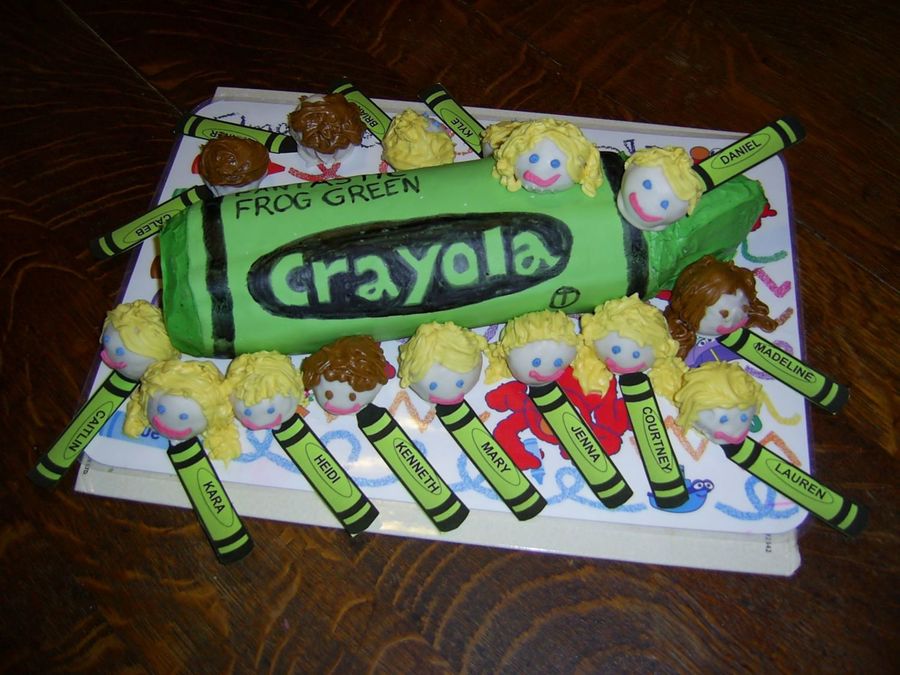 Cake is Yellow with cake ball heads dipped in tinted white chocolate with BC hair. Crayon is covered in MMF and painted with black food gel.