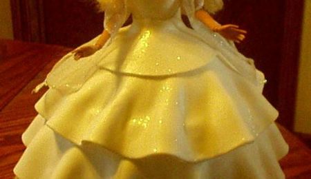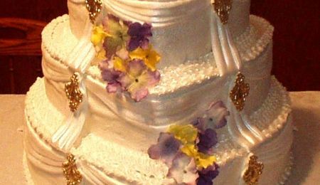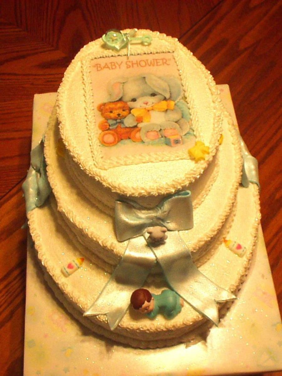 3 stacked ovals iced in buttercream, blue fondant bows, and the invitation was used as an edible image. Then everything was airbrushed pearl white and last the sugar decons, baby, and rattle was added.