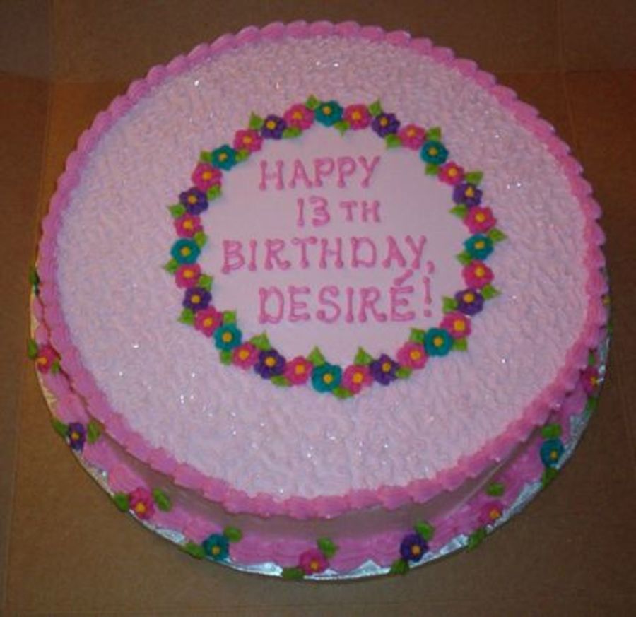 This is a 12" round French vanilla cake, no filling. The birthday girl requested pale pink icing with brighter pink, purple, and turquoise (turned out more teal!). The drop flowers are made from buttercream - up until now I have only made them with royal icing...these turned out great!). Pink on pink cornelli lace with cake sparkles.