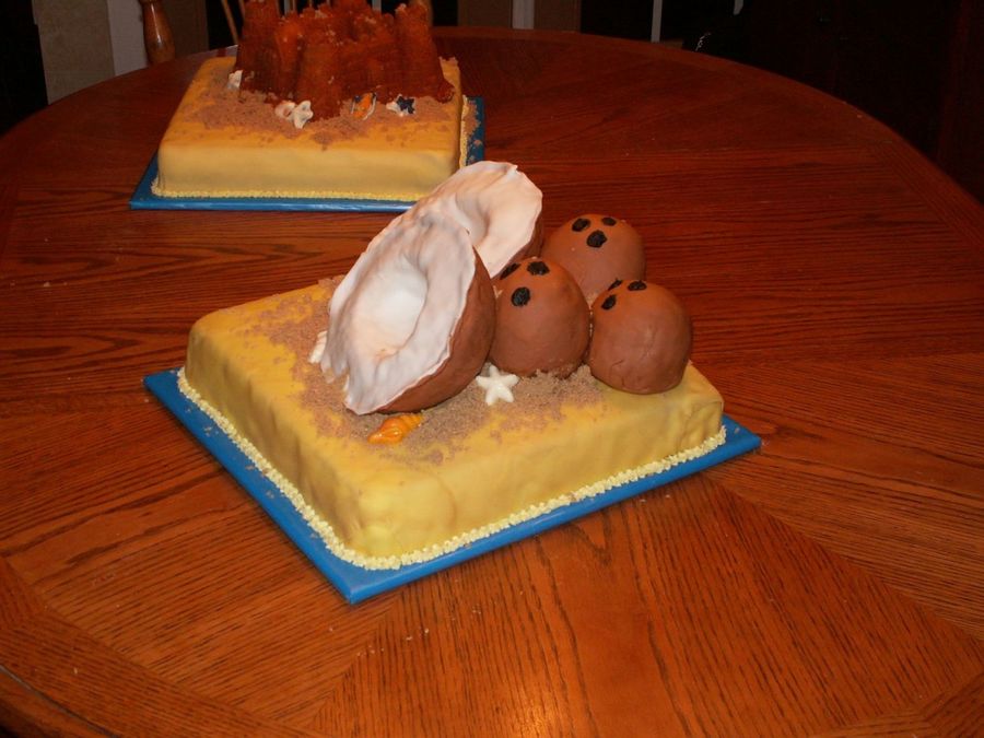I made these cakes for a laua. The lady is making palm trees out of pineapples so the coconuts on the beach went with the theme. She was thrilled. I also added chocolate shells