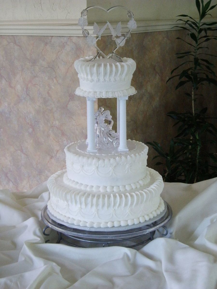 - 14", 10" and 6" top - each double layer, White BC w/Royal overpiping - Chocolate layer w/Traditional Yellow so everyone would get a piece fo each