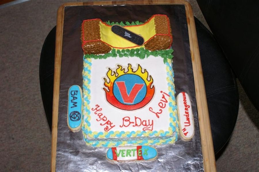 This cake is my husband's idea and he helped me a lot with it. It's a white cale with BC decorations. The skateboard on the ramp is a toy, three others are cookies decorated with RI. The cake is for a boy who is into skateboarding.