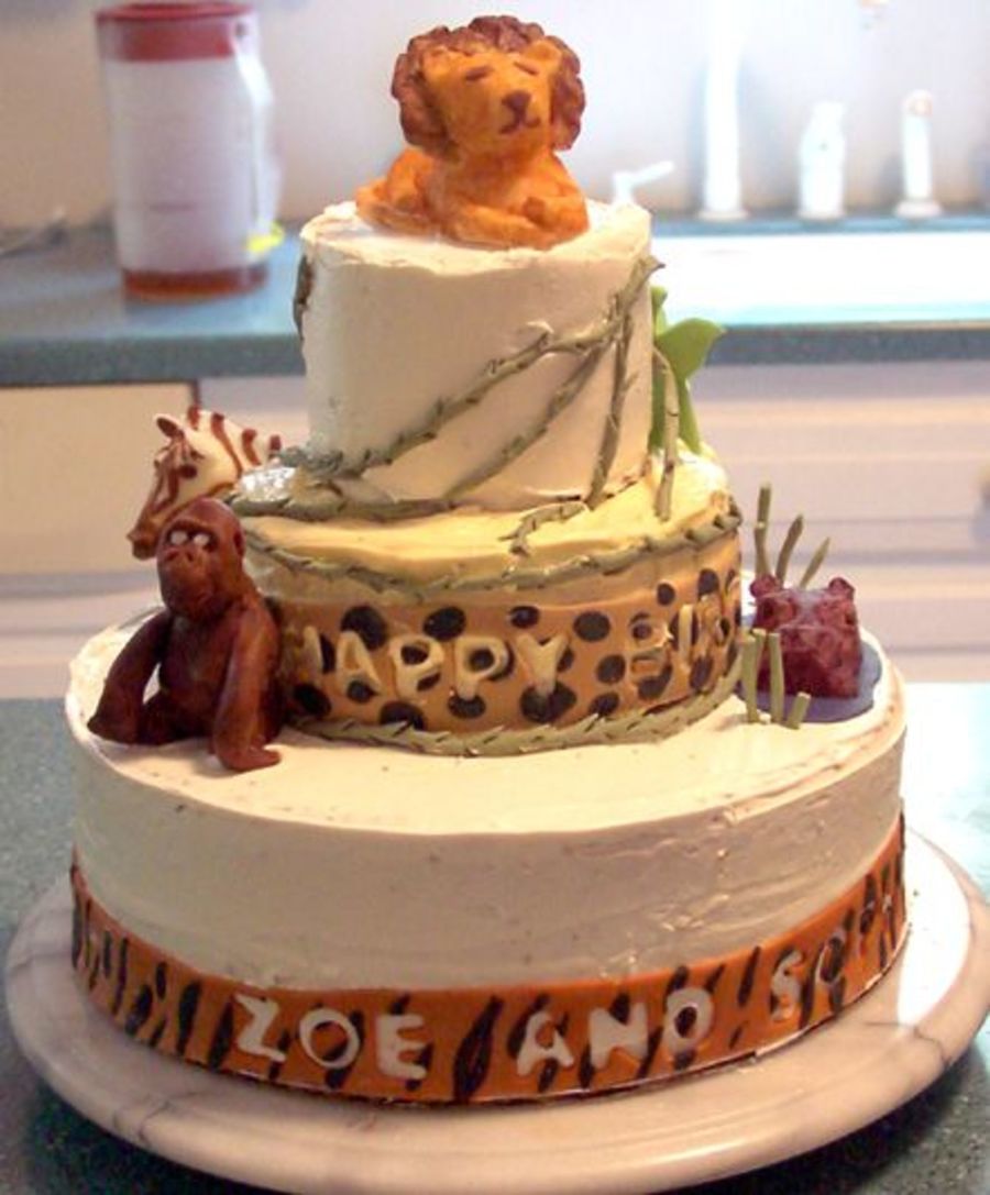 This cake was a hit at my 3 year old twins' 3rd birthday party. It's 3 layers with buttercream frosting, candy clay figures, fondant trim with cut-out lettering and gumpaste vines and tree. The cake itself was chocolate for the top two tiers and white cake on the bottom.