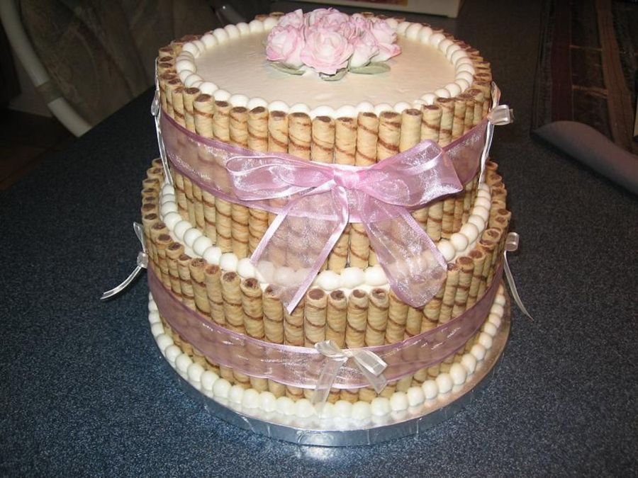I got many of the ideas for this cake from the gallery - thanks!! It is pound cake with cannoli filling, wrapped in buttercream, covered with chocolate hazelnet cookies and topped with fondant roses.