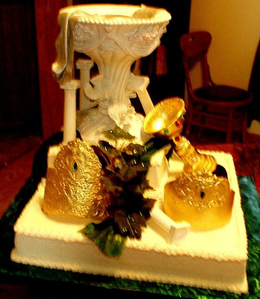 The chalice and crowns are gumpaste, painted gold, and jewels were then put on.