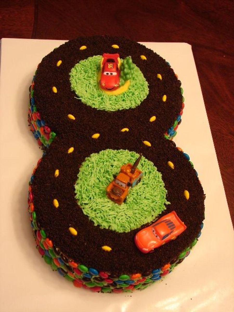 What a great cake! I bet he loved it. I am betting he is turning 8. Did it take forever to get the M&M's on the side? What is the road black icing or did you sprinkle chocolate crumbs on it. It is really awesome!