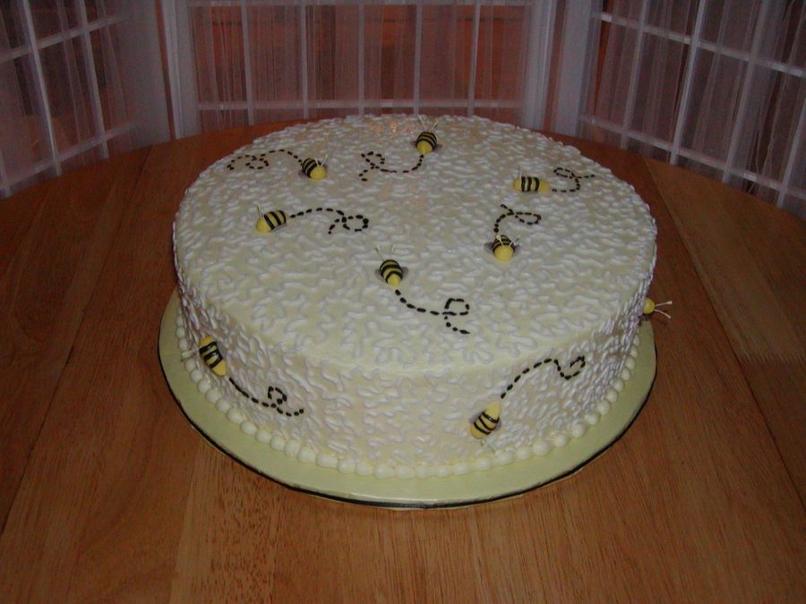 14" Yellow w/raspberry filling iced in yellow BC, bumble bee's are fondant.