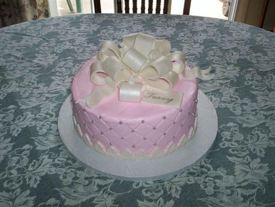 I did this cake where the theme colors were pink, silver and white. The base icing is butter cream - the bow is fondant. Beckylovescake