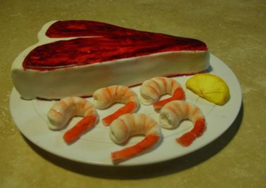 My husband is not a big sweets fan, His favorite thing is steak and shrimp so I thought why not a steak cake. The shrimp and lemon are gumpaste color with luster dust . The cake is fondant (hand painted the red)