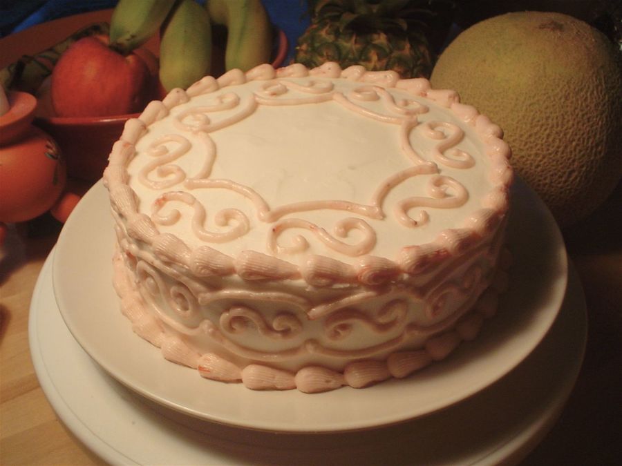 "Strawberry Cake from Scratch" recipe from the website, filled with fresh strawberries, and frosted with Wilton's Snow white buttercream.