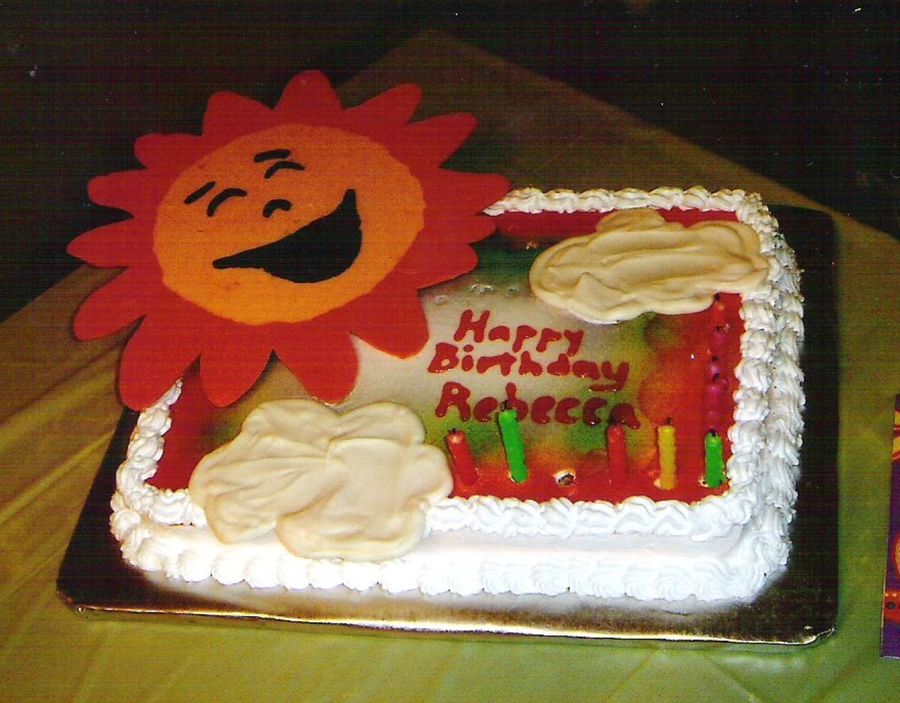 This a buttercream cake with Sun and clouds done in candy melts. Spray on color for the tie dye look.