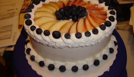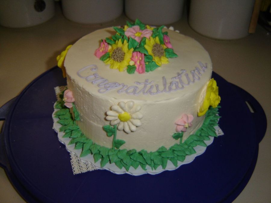 Technically, this cake went to a graduation party, but it doesn't have all the bells and whistles that belong to a graduation cake. Thought I would be different. It's a strawberry cake with Cali4dawn's buttercream as filling and decorating. Royal icing flowers.