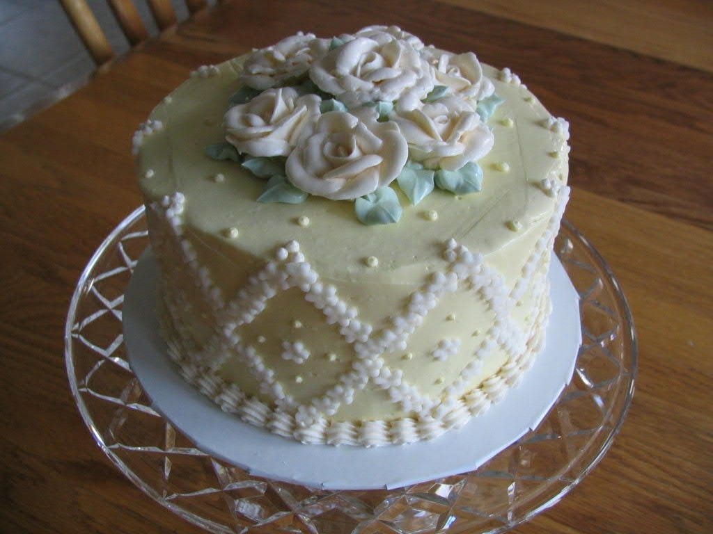 This was a practice cake. It took forever to apply all of those little mmf flowers on by hand. I did not have a flower plunger at the time and even if i did, i do not know if it would have worked on buttercream.