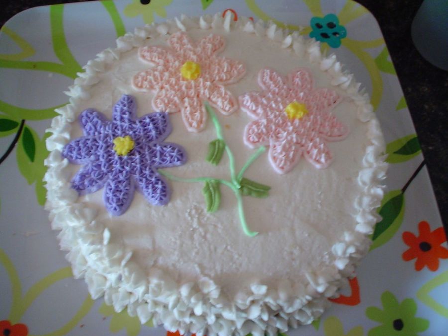 This is an 8" round cake w/ BC frosting. It was the first cake I had to decorate for my 1st course of the Wilton decorating class.