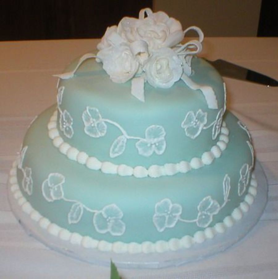 The embroidery itself probably took about 2 hours, partially because it's time consuming and partially because it was my first attempt. The fondant is Wilton Cornflower blue into MMF, the embroidery is just plain white royal thinned with piping gel. It was really fun, glad you liked it!