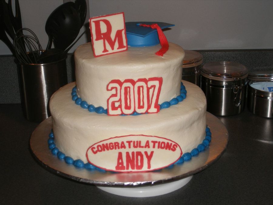I donated this cake for a silent auction. Marble cake with chocolate BC filling and buttercream dream. Chocolate transfers with a gumpaste cap. The grad's mom didn't give me much to go on and his school colors made it tough to keep it from looking like a 4th of July cake. I'm pretty happy with how it came out though.