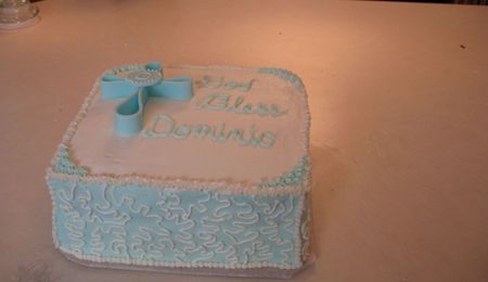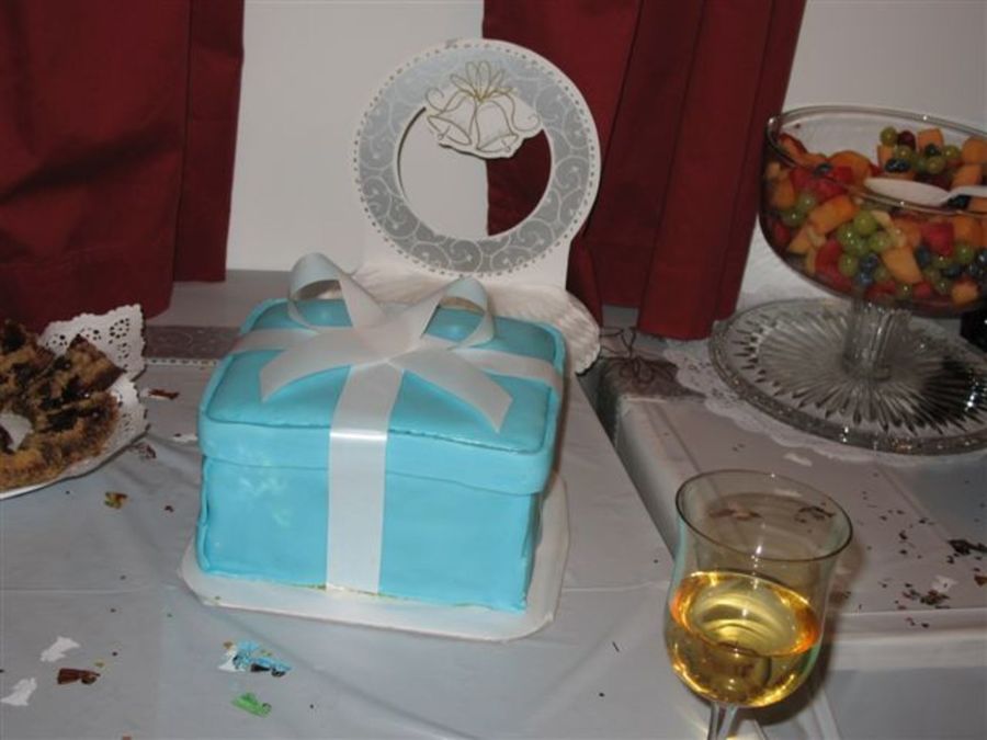 This is the first time I have ever used fondant before. It was quite the experience too. My attempt at a tiffany's box cake -for a girl friend's Bridal Shower. I wasn't to happy about the final product but the party loved it.The filling of the cake is cream cheese w/ ameretto.
