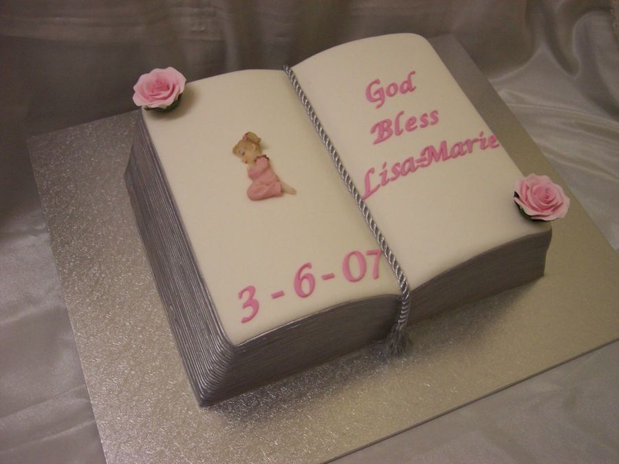 dark chocolate mud cake covered in white fondx. Gumpaste lettering and roses. Rope is fabric and figurine is ceramic to match what was used on the invitations. Side pages are painted with silver dust mixed with alcohol.