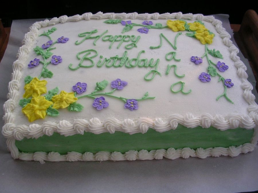 This was a 1/2 Vanilla, 1/2 Chocolate layered Rectangle Cake with Chocolate Buttercream Filling and Vanilla Buttercream Icing and Decorations. I enjoyed doing this cake (for my mother-in-law and about 30 people.) I got the idea from the Wilton Course II booklet.