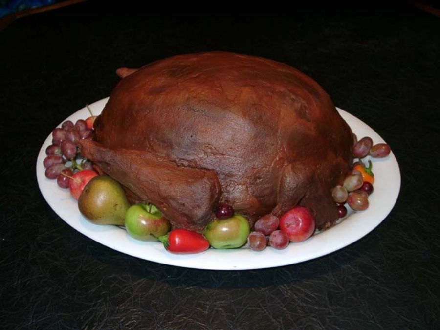 .Made for the family thanksgiving dinner. I used the largest oval pan, made several layers, and topped off with the football pan. Drumsticks were made from cake scraps. Iced with chocolate buttercream and then sprayed with Wilton color spray (first orange, then black) to get that "roasted' look. Decorated with real fruit. The kids walked inthrough the kitchen, saw the real turkey there, then came into the dining room and asked why there was another turkey sitting on the table!