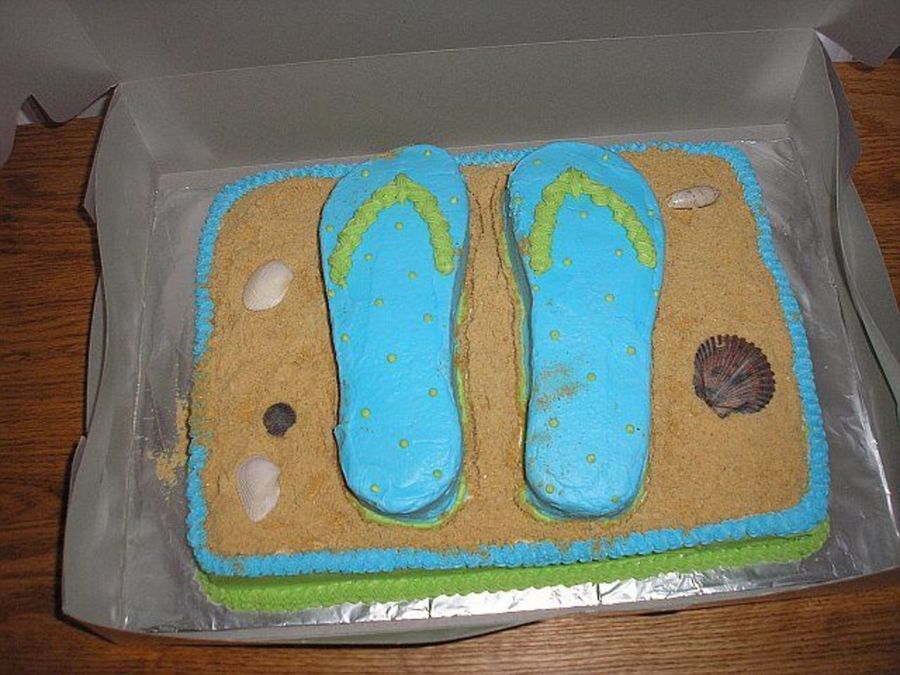 This isn't as good as some of the flip flop cakes on here, but the recipient loved it! Its a chocolate cake, covered in buttercream icing. The flip flops are a yellow cake also covered in buttercream icing. The "sand" is made from graham crackers which I put in the blender to make them super fine. I wanted to make the shells from chocolate, but I ran out of time, so I had to use real ones from our last trip to the beach!