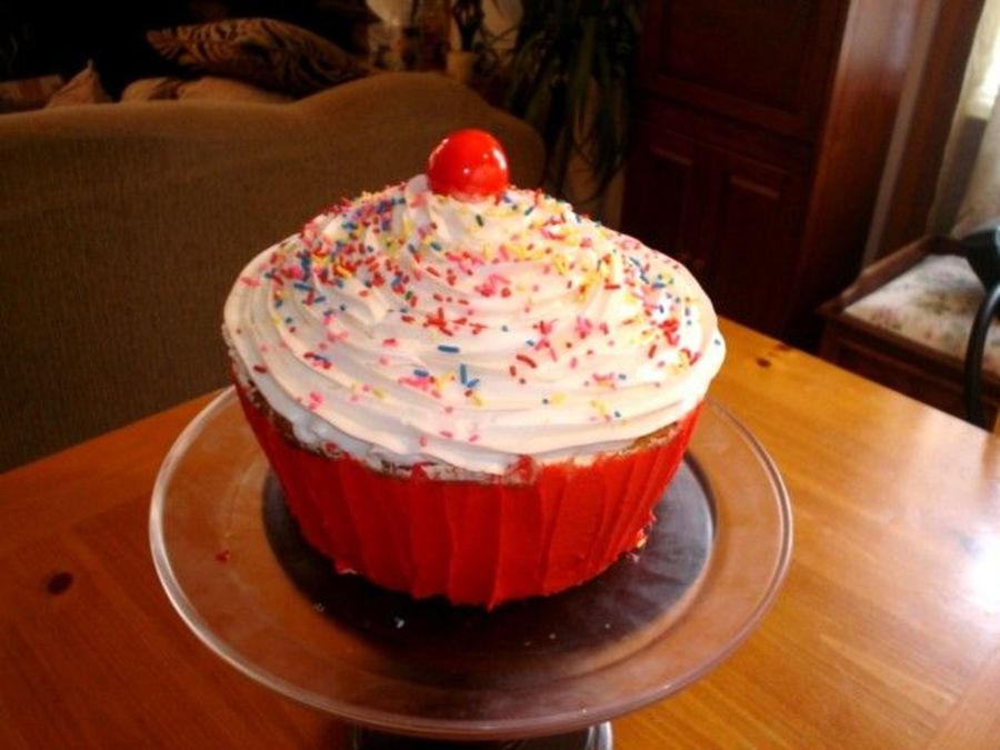 The 8" cakes are on the bottom with the 9" on top. I simply starting carving from the top down at an angle to make it taper like an actual cupcake. I used a 1M tip for the swirls on top building it up to a peak (I didn't level the top layer and that helped). You would be surprised at how simple this cake was to do, I know I was.