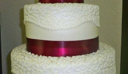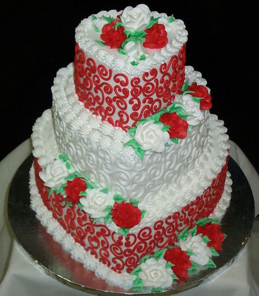 This is a beautiful cake and I love the red scrolls.