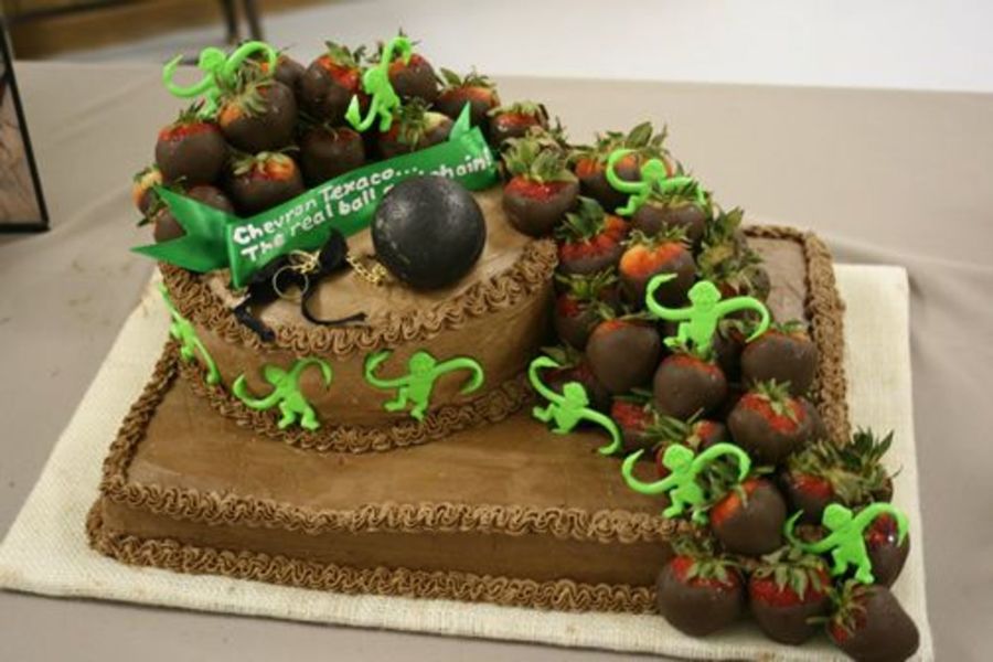 the ball and chain was actually my dad's cake topper when they were married. It can be made out of any styrofoam kind of ball. Just a attach the chain to the rings that people use to decorate tables and a metal circle piece that you can screw into the ball and open the chain piece to the chain. thanks!