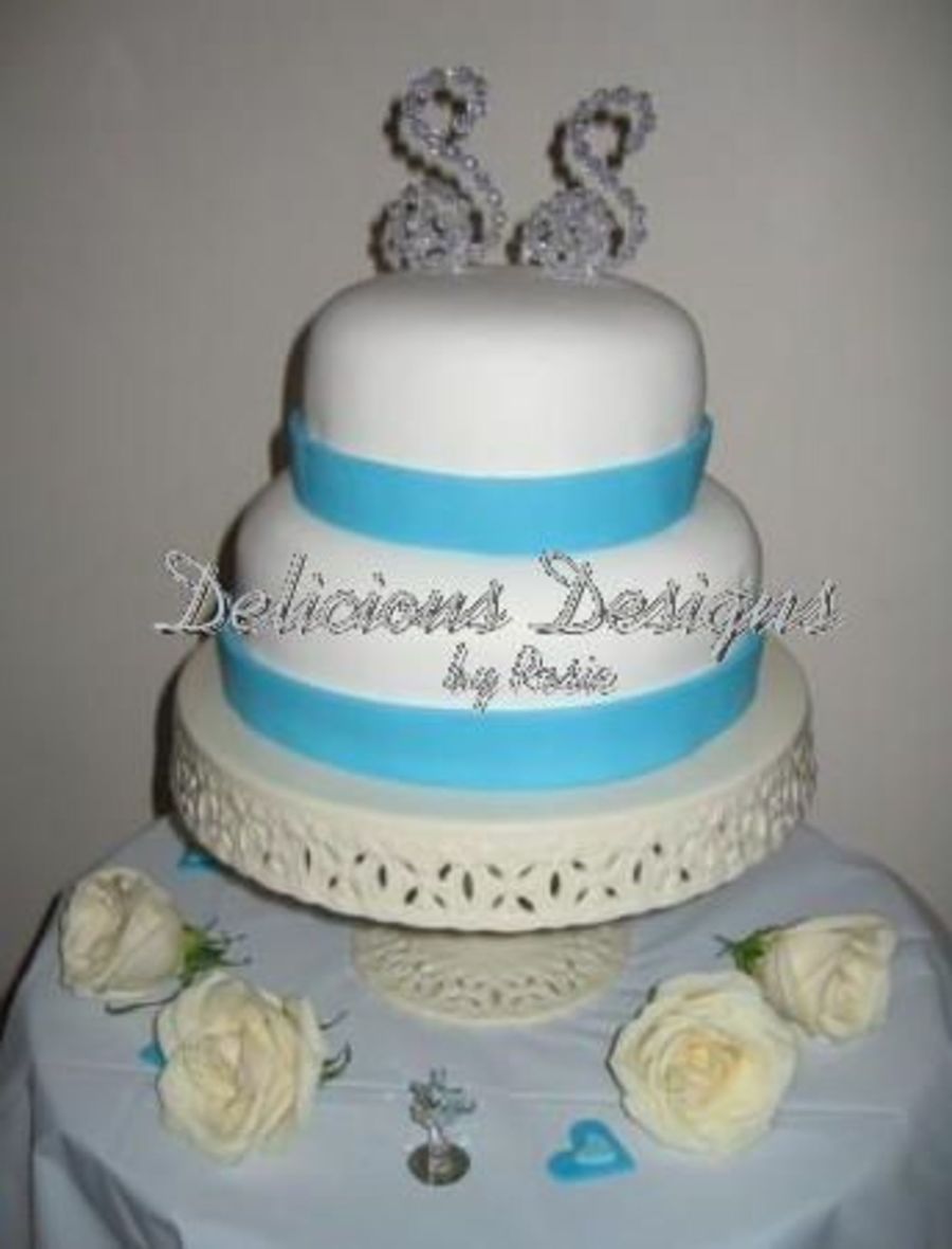 This was for my sisters 10yr Anniversary....White Fondant with blue accent...those were the color of the decorations. I made the cake topper out of wire and some crystal beads from the craft store. Not too shabby for my first time at that topper, huh?! (hahaha!) Sorry the pic isnt too clear. And also wanted to thank Cupcakes for her help with this cake...I tried to do one of her designs but couldnt get it as nice as hers so I went for this look. But I truly appreciated her help! Thank you Cupcakes!