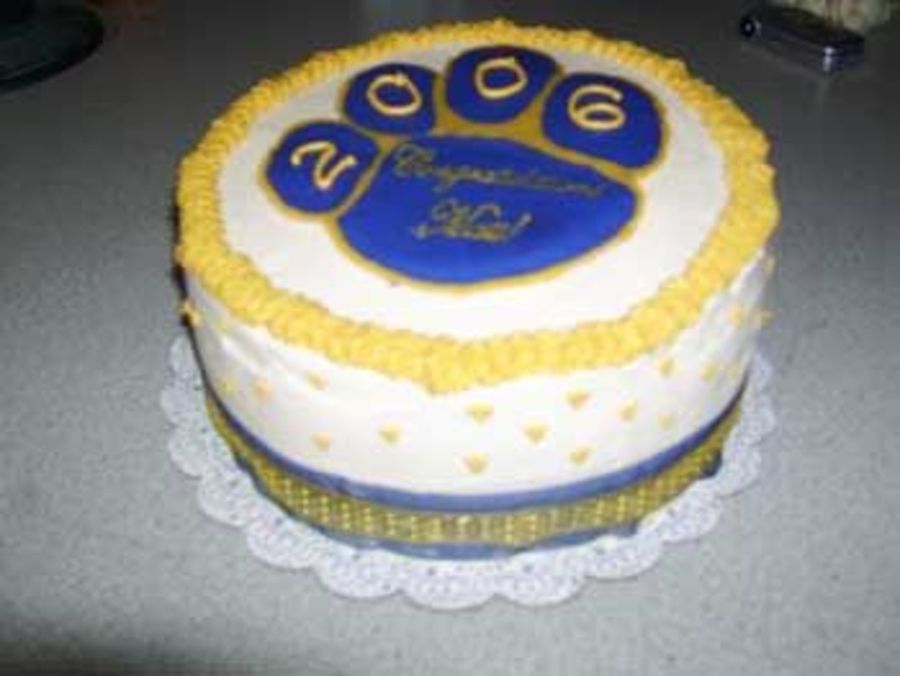 I did this cake for my brother's graduation. The paw is made from white chocolate. It's a vanilla cake filled with coffee mousse and covered in bc and swiss dots (I think they're called) and then two different ribbons in his school colors.