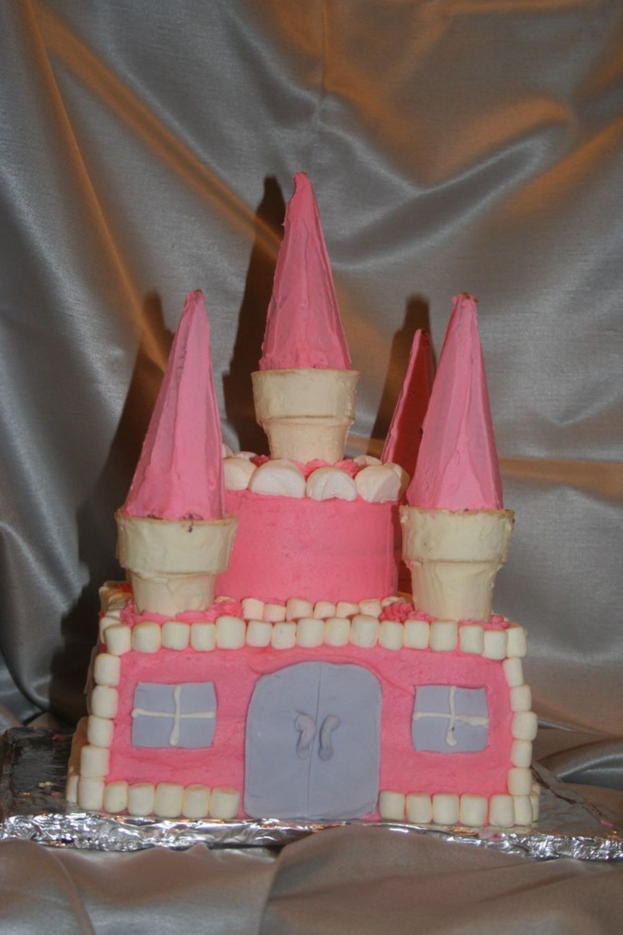 My first attempt at a castle( I got many ideas from cakes off this site). I used fondant to make windows and doors. Both sugar and cake cones to make the towers and turrets. Marshmallows made the "bricks" on the wall.