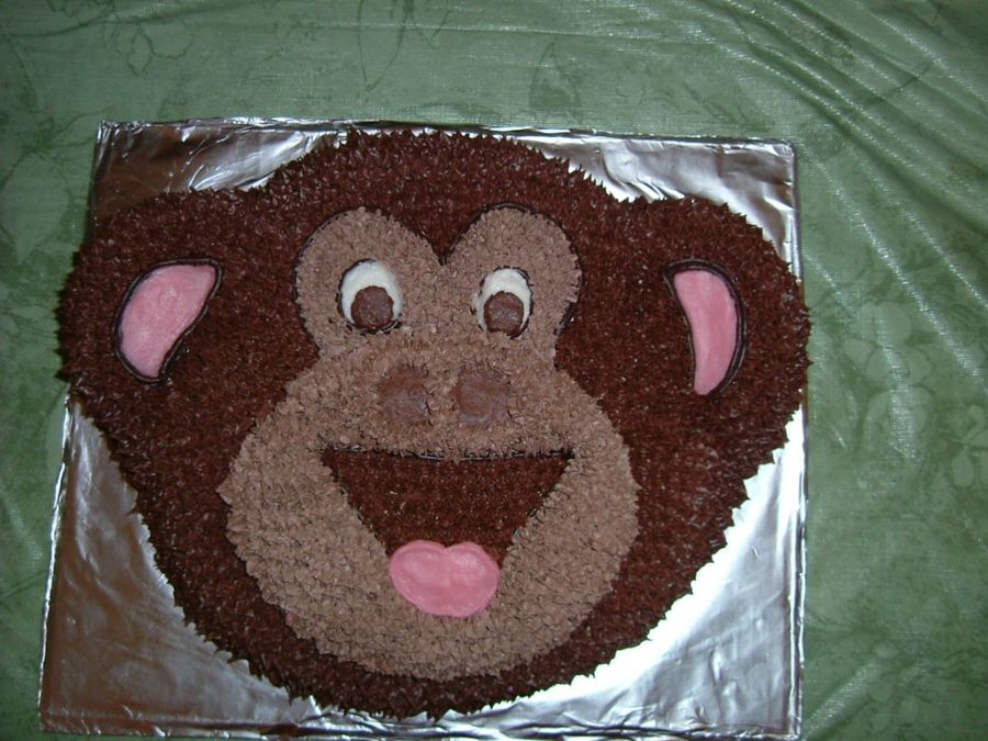 This was the second cake done for my son's 3rd birthday. Banana cake and chocolate whipped frosting star tip#16 used. Cracker pan idea from wilton. This one my mom loved. She said it was like eating a real banana. And the scent of the frosting was wonderful.