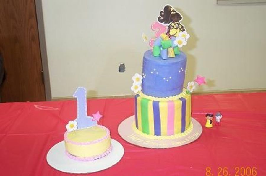 Here is the cake and the smash cake. The original idea came from Boween's Princess Dora cake. The top was sliding, but thanks to the dowel rod stayed in place. We just told everyone it was a 'whimsical' design, LOL. Top was white cake, bottom was chocolate. Iced in BC and marshmellow fondant accents. Dora was a chocolate transfer.