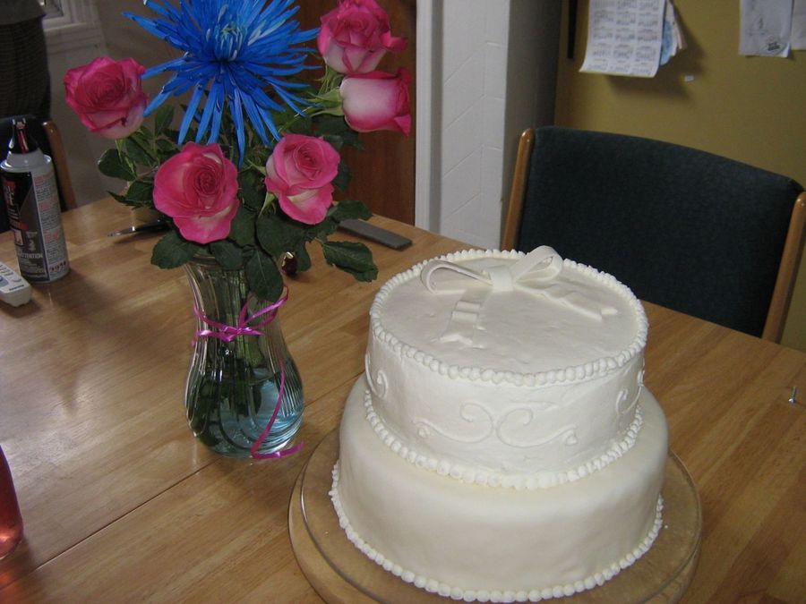 This is a dummy cake used for practice. Bottom is covered with fondant and top is convered in buttercream with fondant bow. Hard time smoothing the icing because of lumpy saran wrap convering the dummy and dummy was too light! Was fun though!