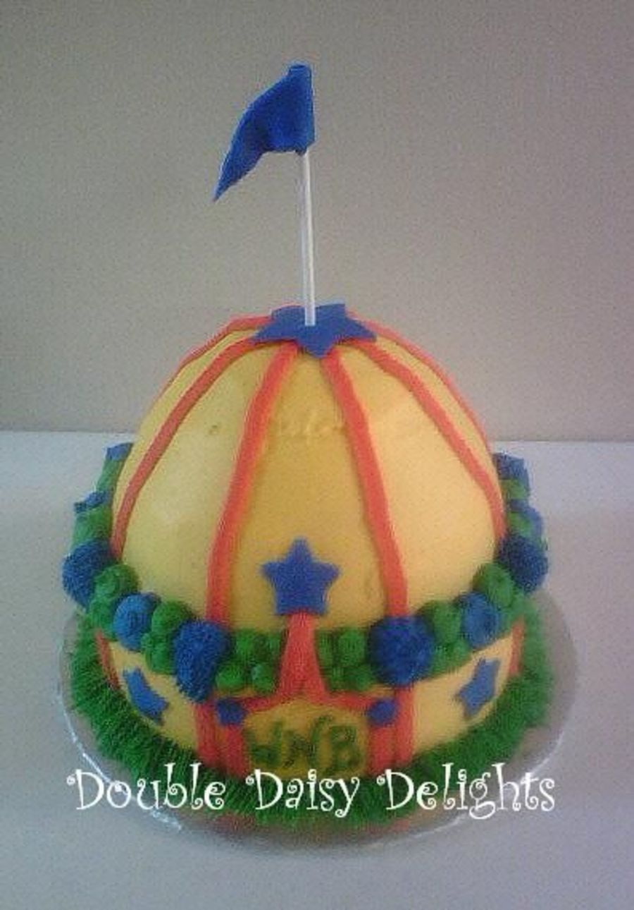 A circus tent for a local bank doing a marketing promotion with a circus theme. The cake is 2-layer 8" rounds with the Wilton doll cake shape on top. Mostly buttercream with exception to the blue stars and flag on top, which are fondant.