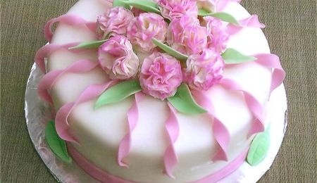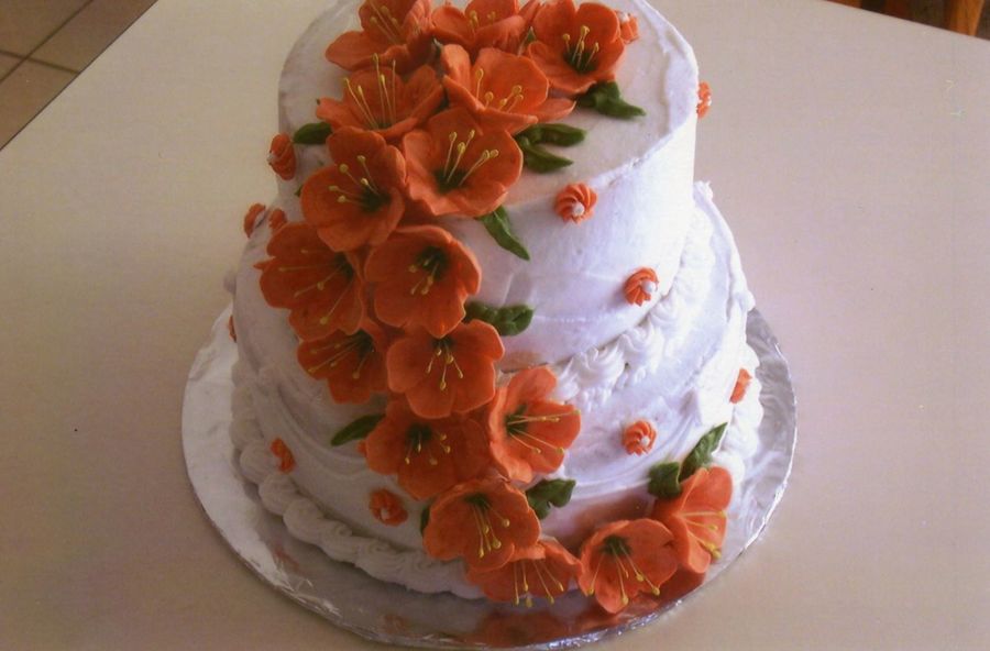 This was my final cake for class. It was such a pain in the neck to make - I kept having trouble with everything! Icing not as smooth as I wanted, flowers way different from what I was envisioning, etc. Anyway, gave it to my mom to bring to work and everyone thought it looked and tasted great so that's all that matters!