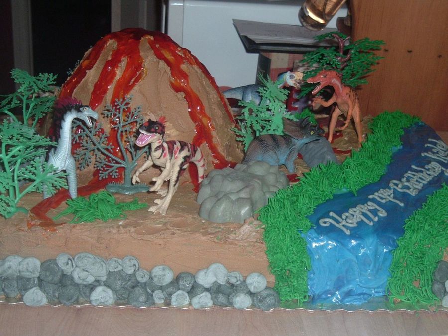 this is one of my fav. cakes , my son was so mad when the lady who ordered it picked it up ... it is also all butter cream , and i did use pipeing gel for the stream and volcano .....
