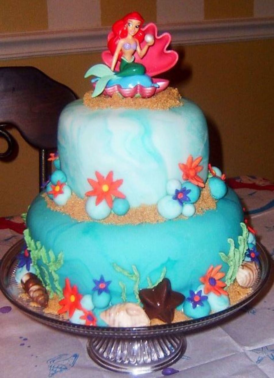 I made this for my daughter's 5th birthday this weekend, we had an Ariel party. I marbeled the fondant to look like water, the bottom layer darker than the top because it's "deeper." I used brown sugar for sand and made the flowers out of fondant. The seaweed is buttercream and the seashells are chocolate (Wilton candy mold). The cake is yellow with regular buttercream.