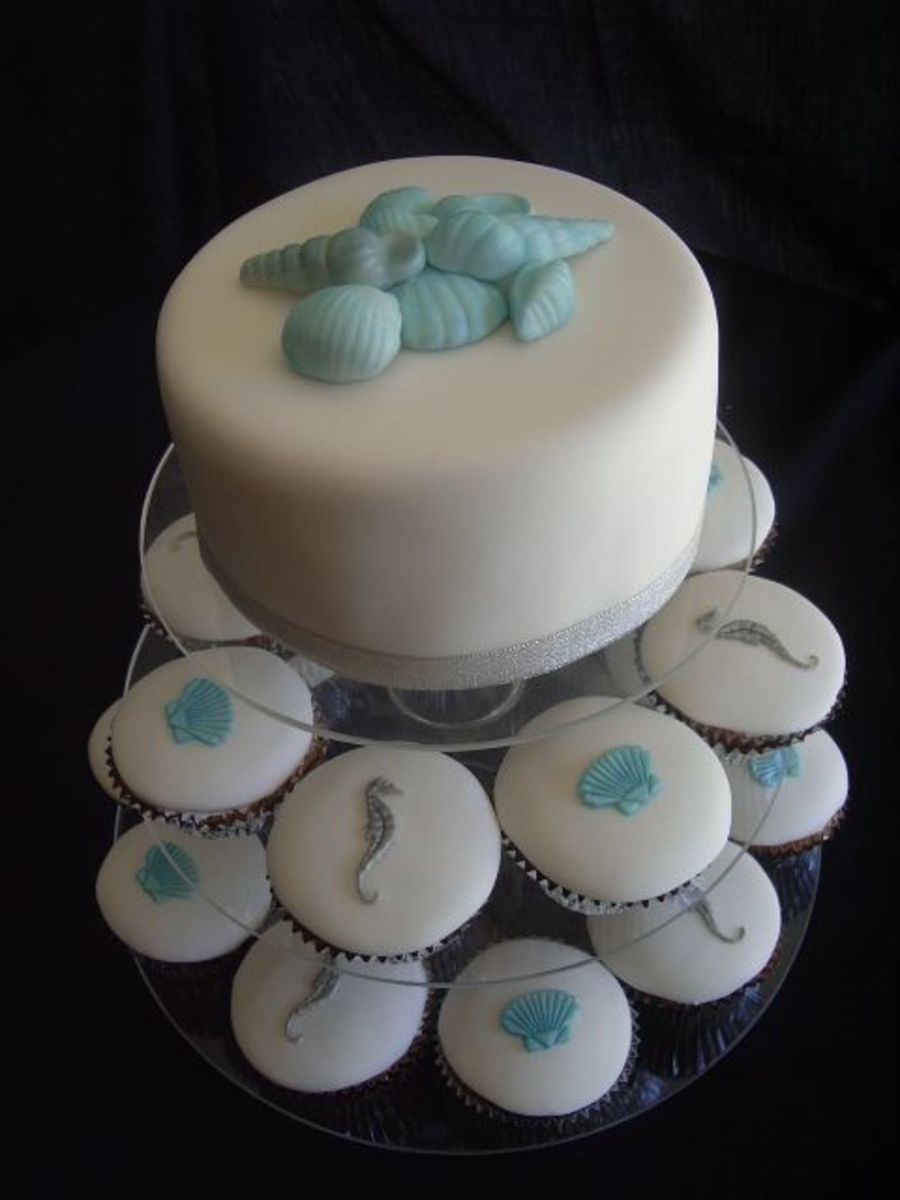 This was just a practice, the top cake is a dummy covered with fondant and I made fondant topped cupcakes to go with it. Shells were from moulds and cutters