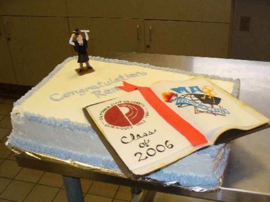 This was a cake I made for husband who earned his master's degree. The cake is iced with Frostin Pride/Pastry Pride. the "book is made of fondant and rice paper. Of course the figurine is plastic. The cakes were slightly damaged in transporting them but they turned out alright.