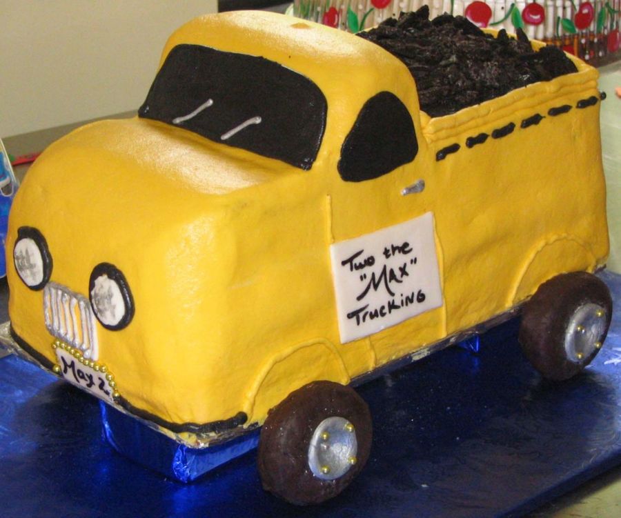 Here is one of three cakes I did this past weekend (I will post the other two soon). This was a choc. cake w/cookies & cream filling. BC icing for most, RI grill, wiper blades, door handles & wheels painted w/silver luster. Luster accents on BC headlights. MMF signs and license plates (front and back). Dragees around plates and on donut wheels for some added "Bling, Bling!". Boy's name was Max and obviously turning TWO...thus TWO the MAX trucking. Thanks to fellow CC'ers for their input on the base!!