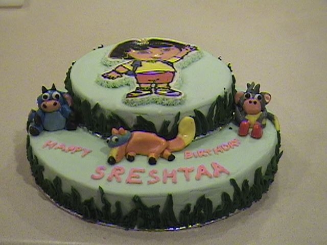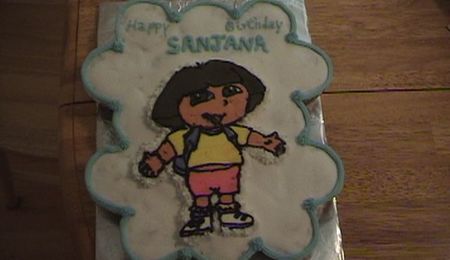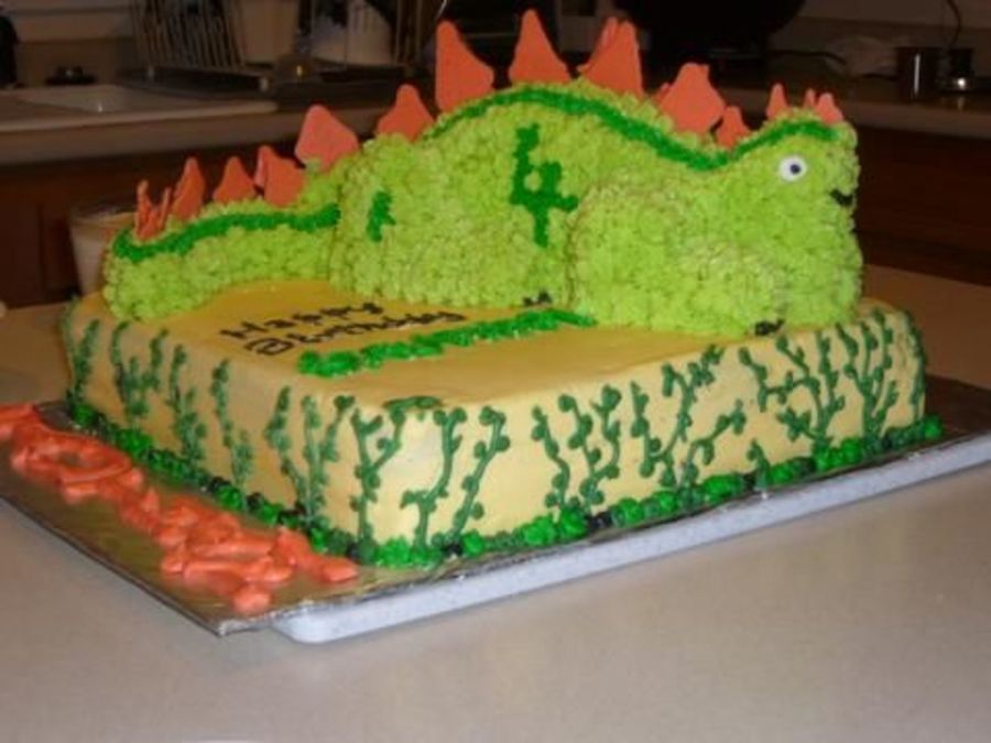 I made this cake for my son's b'day since he is crazy about dinosaurs. The cake and the dinosaur are buttercream and the spikes are made from chocolate. The dinosaur was made from 2 9" round cakes and I got the directions from a website. My son loved it.
