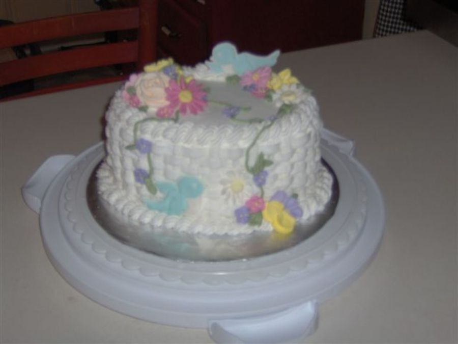 This is my course 2 final cake. Buttercream basketweave with royal icing flowers, color flow birds, and buttercream leaves. The basketweave isn't perfect by any means, but turned out pretty good from an overall standpoint. My hand was cramping by the time I was putting the rope border on so I was quite lazy doing it.