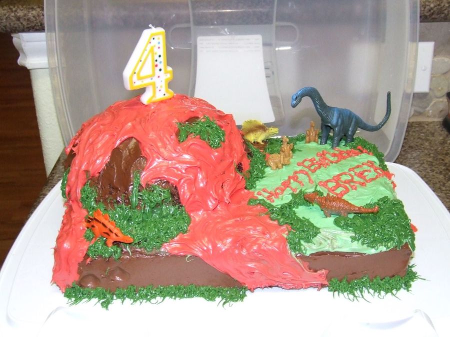 My son wanted a volcano cake. I used Betty Crocker Bake 'n Fill dome pan to make the volcano. Inside the volcano was whipped cream. I used my fingers to make waves and lava flows, grass tips for grass, and dino toys for decor. I served this tofu cake with vanilla ice cream and shaped semi dark chocolate dinosaurs.