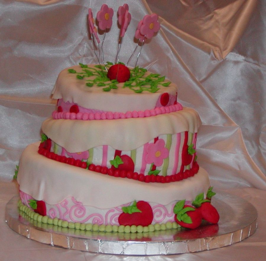 Thanks everyone. I definitely want to try one again with taller tiers. kettlevalleygirl- the strawberries are fondant. I used Americolor Super Red to get the color. It took a little extra but, I got the color I wanted.