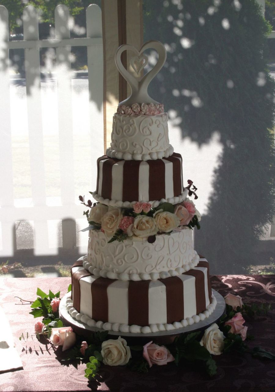 Brides colors were Chocolate Brown and Soft Pink, which is the color of the scroll work on the ivory cakes. Flowers that were to be on the cake were no where to be found, so we made do with some table decorations and the throw bouquet (which we saved some and made a new one for her).