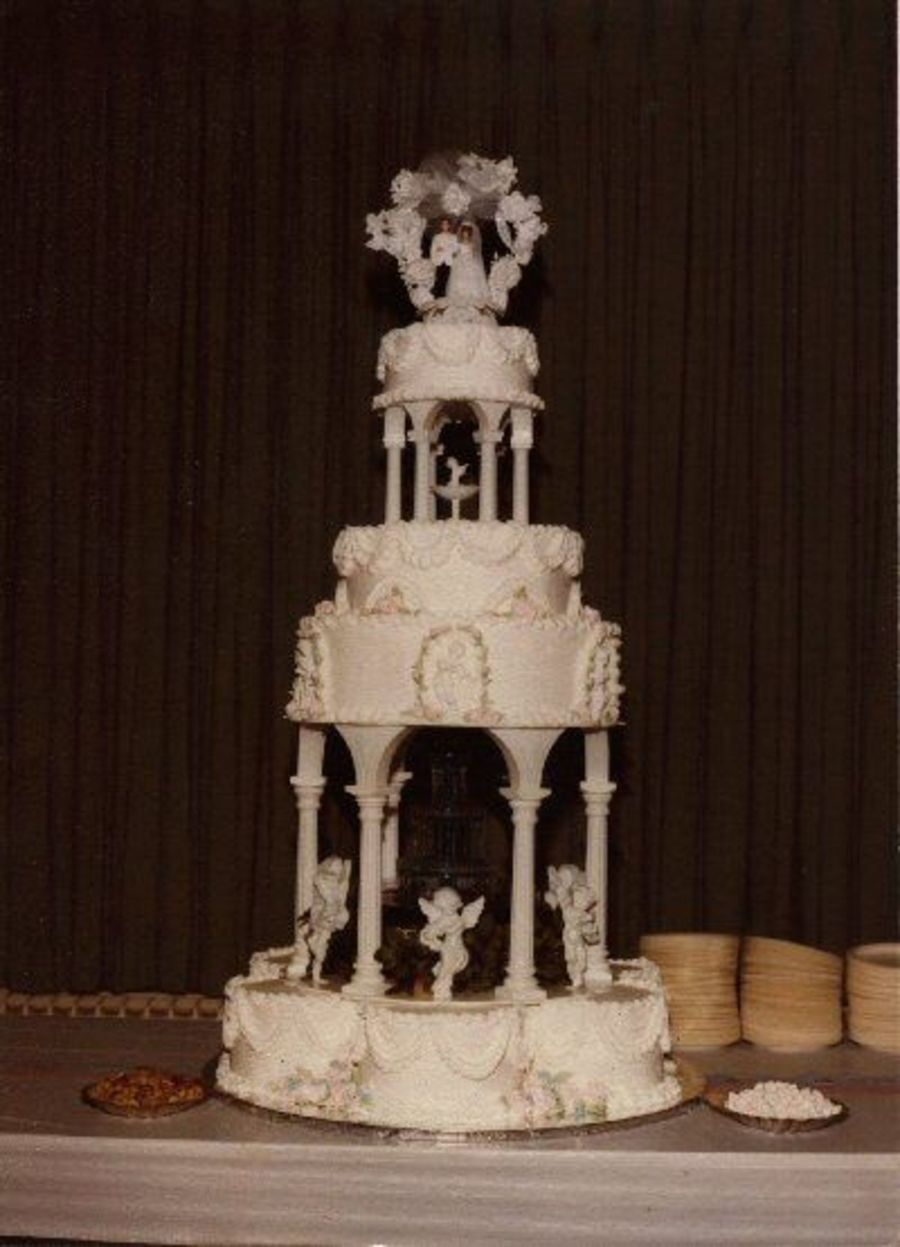 The bottom tier is actually seven 8" rounds. One is in the middle and six surrounding it. The dowels are then placed as other large tiers. It added a most unusual dimension and gave a special place to position flowers. It was also easier to serve and I didn't have to purchase a special pan for the 18" plate to sit atop.