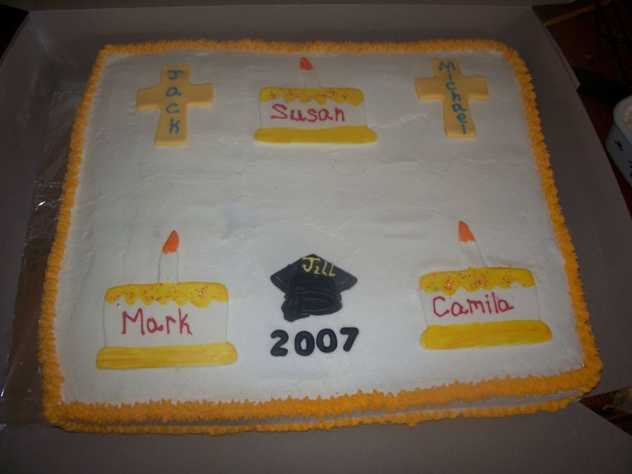 This was a cake I did for my family. We were celebrating birthdays, a First Communion, a Confirmation, and a Graduation.