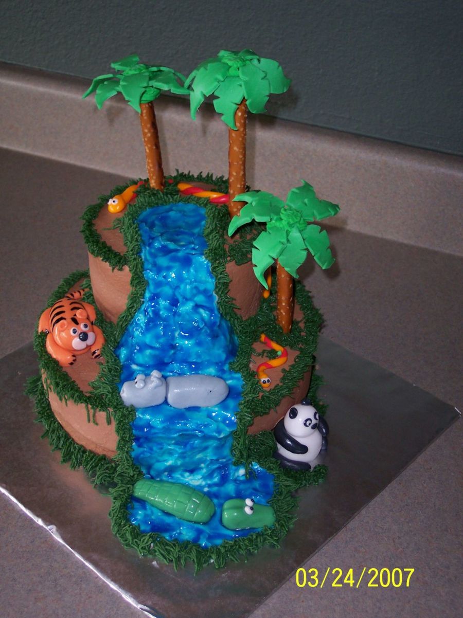 It was a zoo birthday for our oldest (5) this year. He saw one like this on here and said "That's what I want!!!" We had so much fun making it. Animals and leaves are fondant. Trees are pretzels. Bottom cake is chocolate, top is yellow, CBC icing. The boys still remember eating the snakes!