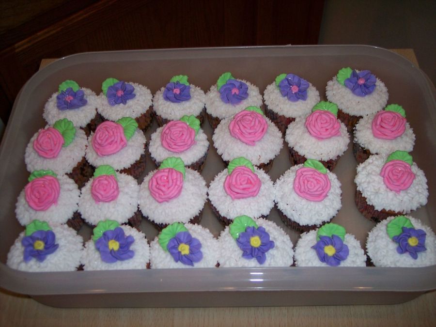 the cupcakes are iced with buttercream using tip # 21 the flowers are made from royal icing
